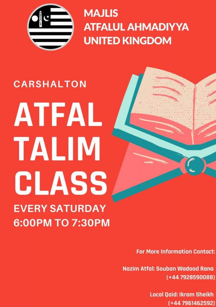 Majlis Atfalul Ahmadiyya Carshalton Qiadat will be holding Insh’Allah its weekly Atfal Class every Saturday from 6pm to 7:30pm.