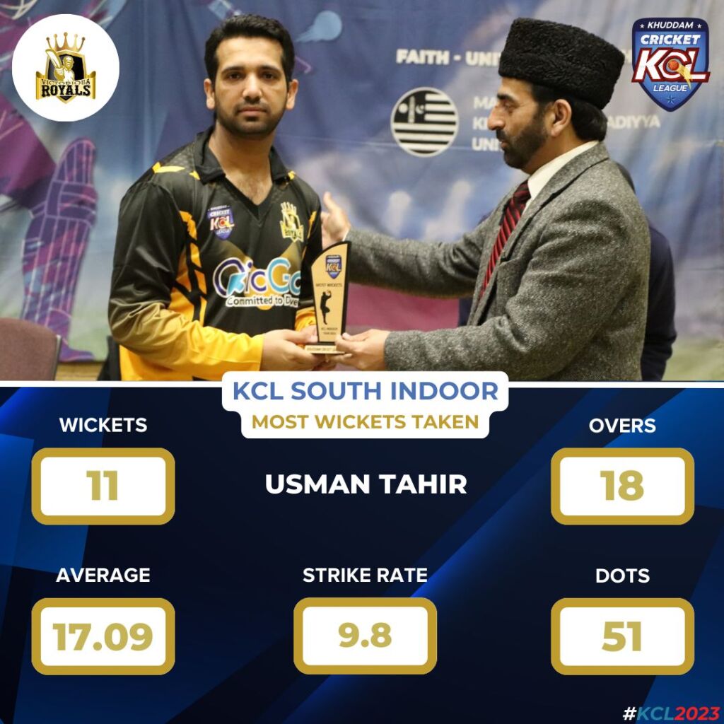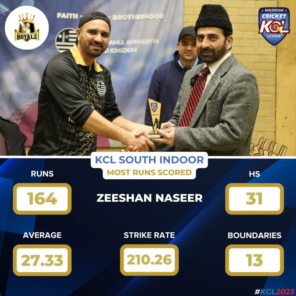 Congratulations to all teams in another successful seasons of KCL indoor league and a special congratulations to Victorious Royals for lifting the KCL indoor 2023 cup. Finals day was then concluded with a prize distribution session which was graciously chaired by Rana Khalid Ahmad sahib, murrabi Silsila UK. Khalid sahib distributed the prizes amongst the winners and runners up teams of the tournament and gave a brief talk about the high level of cricket played amongst the UK khuddam. Prizes were also given for best batsman of the tournament which was awarded to Zeeshan Naseer sahib and best bowler of the tournament which was awarded to Usman Tahir sahib.