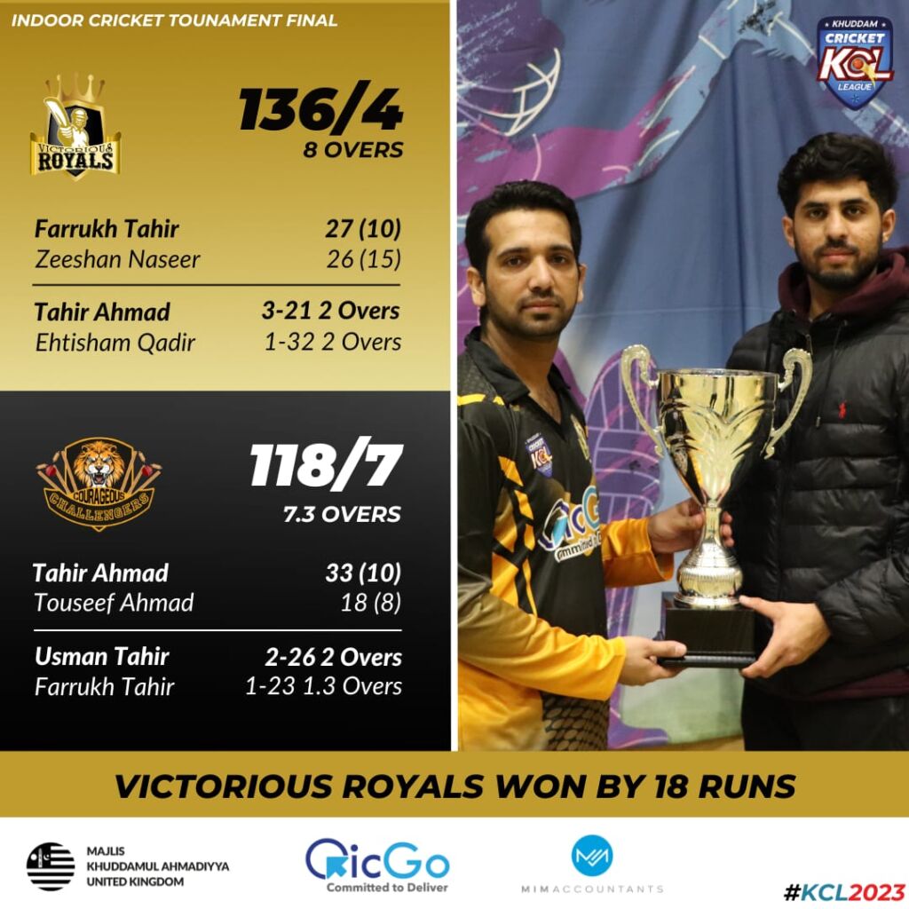 Both teams, having performed exceptionally well in the league stage and the semi-final now met in the final to fight for the KCL indoor 2023 crown. Victorious Royals won the toss and elected to bat first and put up a valiant effort to score 136/4 in their allotted 8 overs. This was a good score and because of the volume of the game, being it the final, 136 looked a tough task for Courageous Challengers. At the half way stage of 4 overs, Courageous Challengers had scored 66/2 with their captain Tahir Kang leading the chase and it looked like they will go on to chase this big total. But as we seen in the past games throughout the tournament, the might of Victorious Royals death bowling took them to yet another KCL indoor title.
