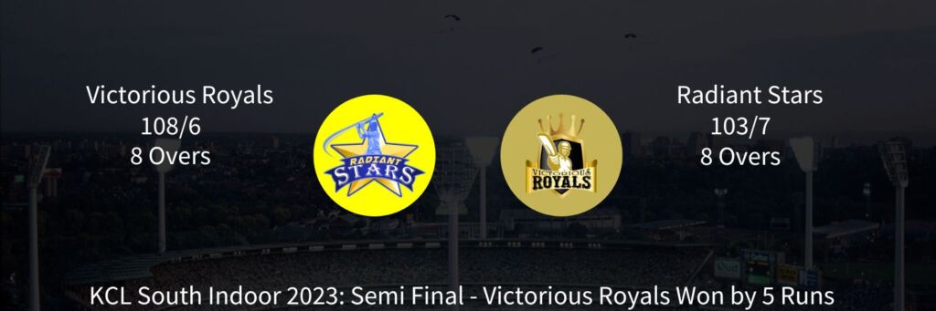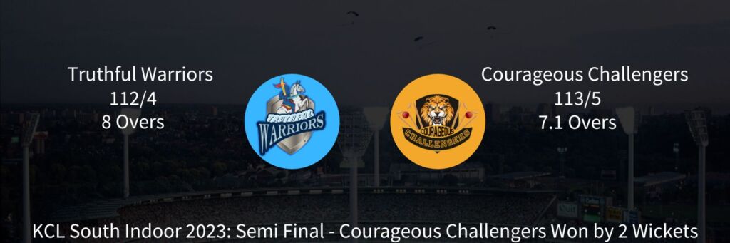 In the second semi-final, Courageous Challengers took on Truthful Warriors. Having won the toss, Truthful Warriors choose to bat first in this crunch encounter. A fighting total of 112 is what they were able to put up and Courageous Challengers would now need 113 in 8 overs to book a place in the final. A strong fight was put up by Truthful Warriors but 113 was achieved in just 7.1 overs by Courageous Challengers, who would now face Victorious Royals in the KCL 2023 indoor final.