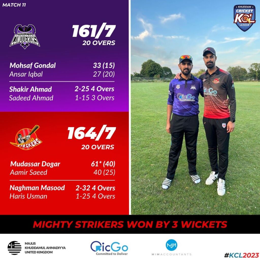 A fantastic chase lead by an inspired Mudassar Dogar who’s match winning 50 provided the Might Strikers with a much needed win. The Conqueror’s who have been winning games on the last ball of matches were this time the ones who suffered the heartbreak. But they would know that catches win matches, and crucial catches were dropped at crucial junctures.