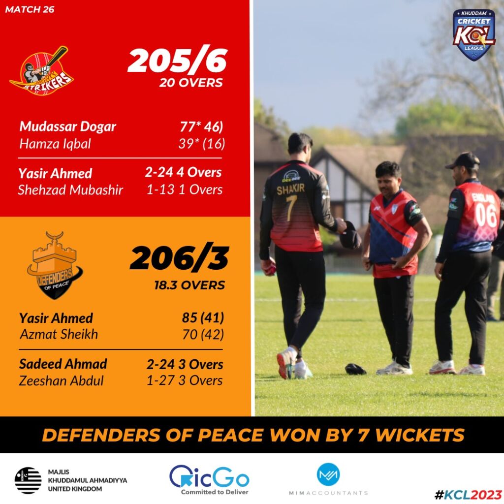 Yasir Ahmed has been playing brilliant cricket for the Defenders, and he was awarded the MOTM today for his brilliant 85 in a huge chase. The Defenders with this win live to see another day as they can target a playoff position with a win in their last match of the league next week. Stuck on 6 points, the Strikers have been knocked off the top 4 due to net run rate, and they now can only hope the results elsewhere could potentially allow them to sneak into the top 4 if another team finishing on 6 points has a lesser nrr than them. Nervous, nervous times ahead for both teams who have participated today!