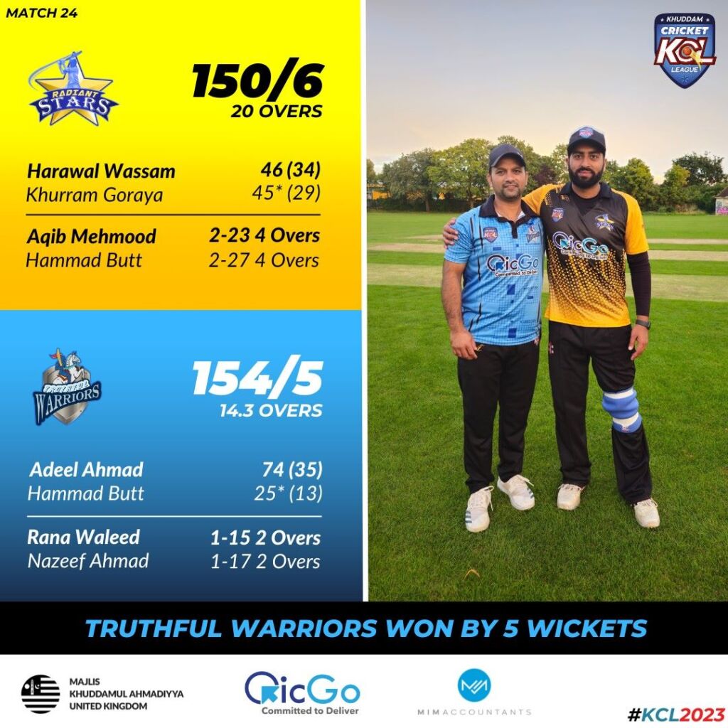 There couldn’t be anyone else besides Adeel Ahmad who deserved the MOTM award for his fantastic innings of 74 runs. A resounding victory for the Warriors whilst also propelling their net run rate in the process, giving them the slightest of hopes to finish with 6 points and ask the question with the nrr for the 4th position potentially. The Stars end their campaign with 5 points in the league table, having looked so good in the early stages with their totally new side from the previous years campaigns.